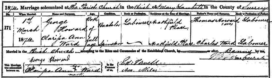 marriage certificate of Clarissa Ann Ward who married George Howard 1st