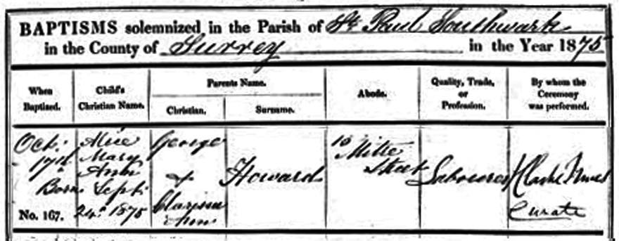 baptism certificate of their first daughter Alice Mary Ann Howard who was