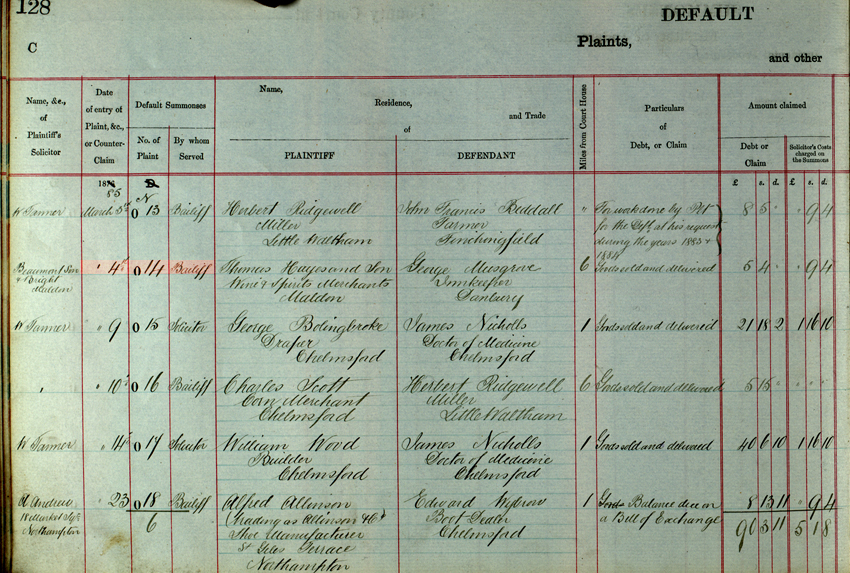 Chelmsford County Court entry on the fifth of March 1885 ( highlghted)
