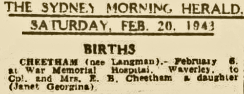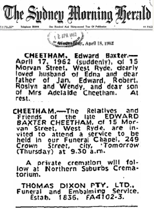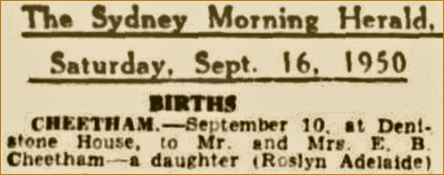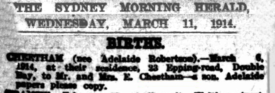 His mother Mary Adelaide Cheetham is listed as now living at 744 New South Head Road.
