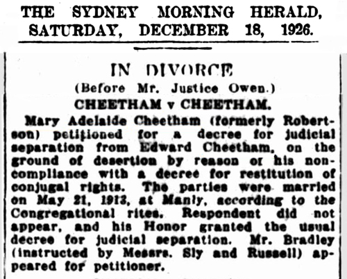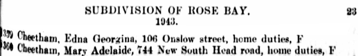 in Rose Bay with her son Edward Baxter Cheetham, and became known as Mary Adelaide Cheetham.