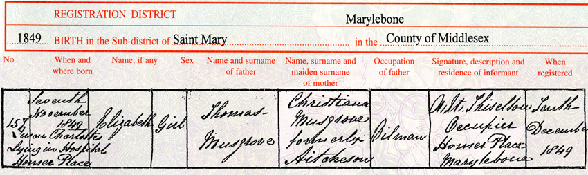 born at Queen Charlotte's Laying In Hospital in Homer Place Marylebone.