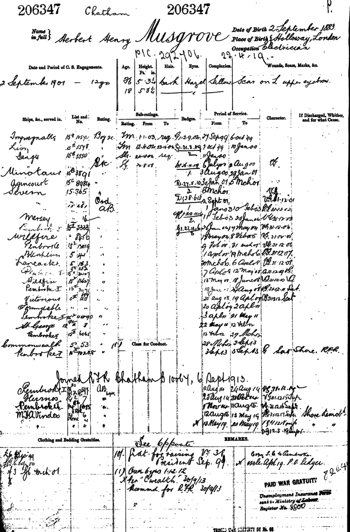 This is the navy record of Herbert Musgrove (son of George and Emily) born 2nd September 1883 as can be seen he served in many ships during his 12 years service.