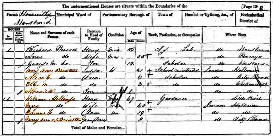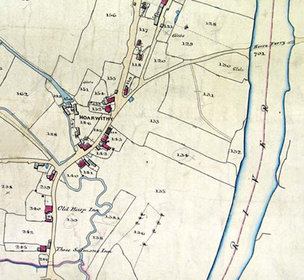 Bristow Family in Hoarwithy Following the death of her husband Thomas Arthington Bristow, Mary Ann Bristow and her four children moved from Islington to the Herefordhire village of Hoarwithy where her parents William and Mary Ann Hollings lived. They had lived in London and recently retired to the area where their family had always lived. The census for 1861 lists the family in the village. Mary Ann Bristow was employed as the village schoolmistress. The entry shows her children Alice aged 6, Ellen aged 3, and Arthur aged 1. Her parents William and Mary Hollings have Mary Ann Bristow's oldest child who was also named Mary Ann Bristow aged 8 living with them. The Bristows left Hoarwithy following the death of Alfred aged 4 in 1864. Mary Ann's parents had also died by 1867. The Tithe Map dates from 1840 just before the church was built the village hasn't changed much over the years and is situated on the banks of the River Wye between Hereford and Ross on Wye. The church pictured below is the 1870s reconstruction. ..................Home | George 2 |