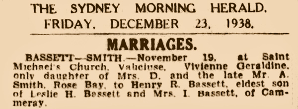 Vivienne Smith married Henry Robert Bassett 19th November 1938.