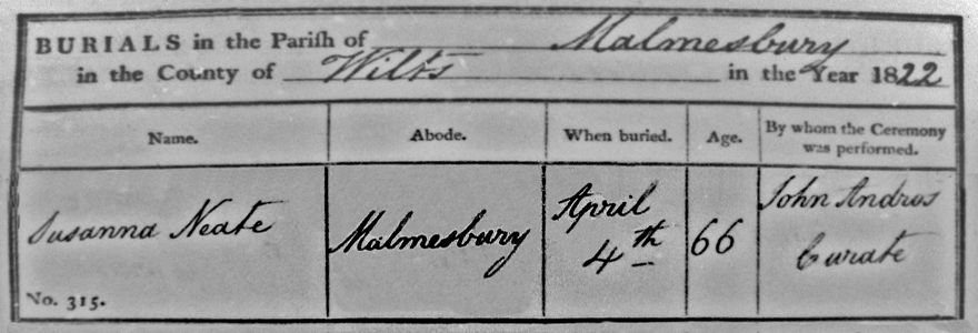 Malmesbury. The certificates below record their deaths and burials. Susannah