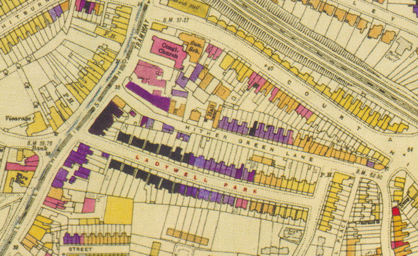 colour coded to show bomb damage during the 1939-45 war. Ladywell