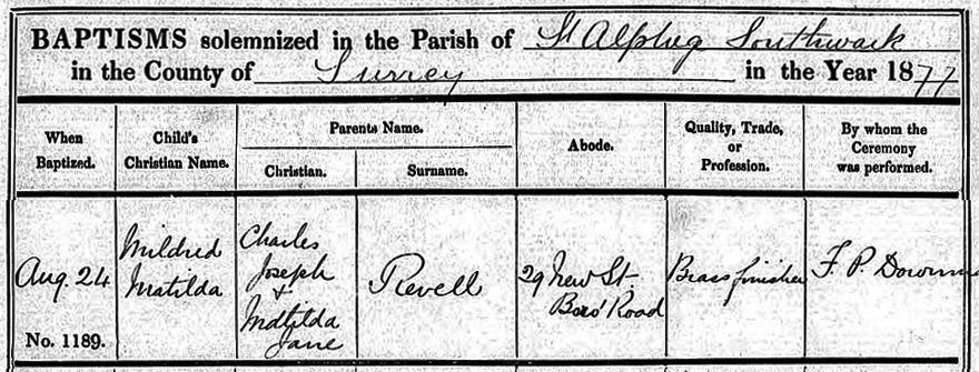 the baptism certificate of their second child Mildred Matilda Revell who