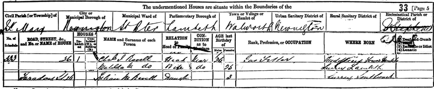 The 1881 census below shows the family living at 26 Faraday Street Lambeth.