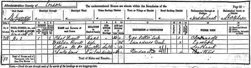 1891 census which shows the family now living at 2 Warwick Street Southwark.