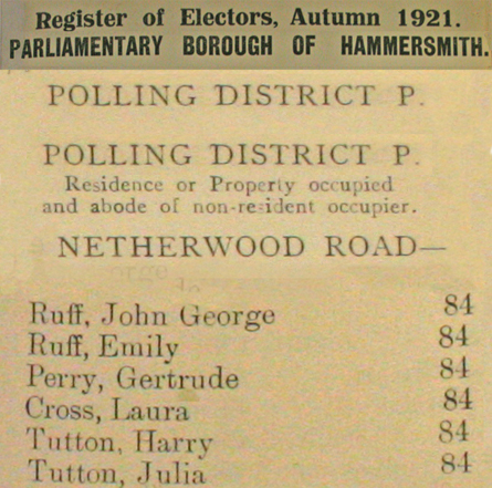 - 1922 Ruff Family at Netherwood Road Shepherds Bush London The family moved from Gillingham to 84 Netherwood Road in 1920. The Electoral Register for this address in Autumn 1921 shows both John and his wife Emily together with other families who shared the property. Above right is Molly aged six photographed about this date. Below is Netherwood Road today. 84 is the house in the middle. Home | George's Story 3 |
