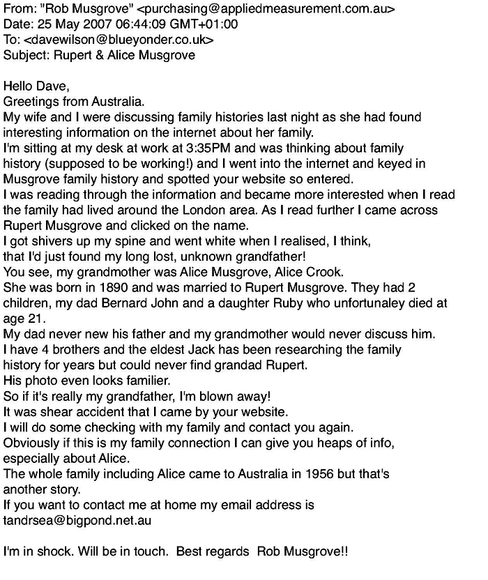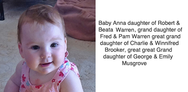 Dean, grandson of Jack & Annette Musgrove great grandson of Bernard & Joan Musgrove, great great grandson of Rupert & Alice Musgrove, great great great greatgrandson of George & Emily Musgrove |