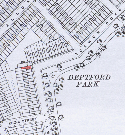 Langman at Scawen Road Deptford Park The above electoral register dates from 1953 and shows Christiana Langman living at 37 Scawen Road Deptford. She had lived here since at least 1945 when she had moved from Esmeralda Road Bermondsey. The map above shows the position of number 37 (coloured red). Christiana lived with the Harrow family as a lodger. All of her own family had by now married and moved on. The pictures below show the house present day. ..................................................Home | George's 3 |