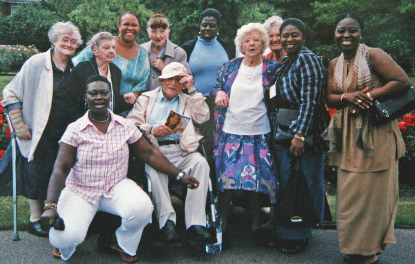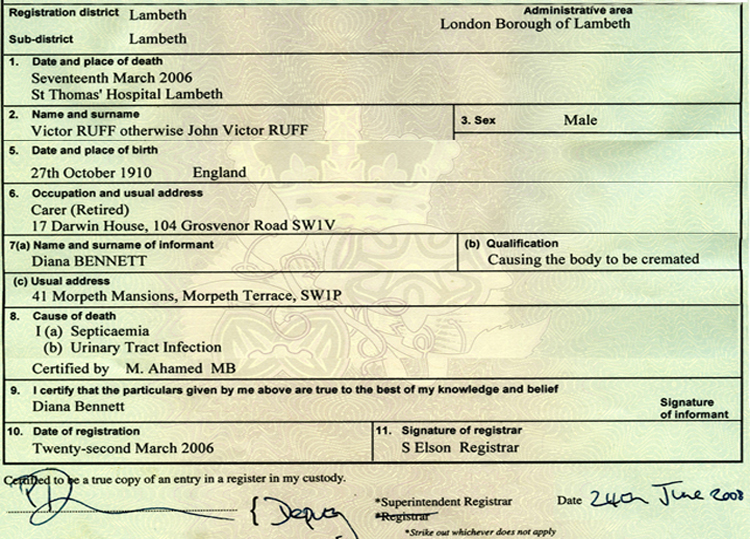 Ruff 1910 - 2006 Victor was born 27th October 1910 in Upper Holloway 22 days after his first cousin Blanche Digby. In later life he became a carer. In his seventies he looked after a man who lived in Dolphin Square on his death he stayed with the gentleman's wife. On her death he moved into sheltered accommodation (bottom left) during this period he was an active member of St Micheal's Church Chester Square ( bottom right) and most days he went to the Pullen Centre near Westminster School we visited the centre and many of the residents had fond memories of Victor (the middle photo is of an outing where the carers and other members are making a fuss of Victor). He enjoyed good health and lived to over 95 his last illness lasted only 48 hours he died in St Thomas' Hospital Lambeth 400 yards from St Mary's Church next to Lambeth Palace where his grandfather George Musgrove married Emily Harris 135 years earlier in 1871. ...........................................................Home | Georges 3 | Musgroves |