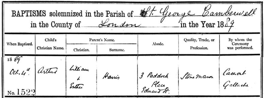 Esther's son Arthur was baptised 4th October 1889 at the parish chuch