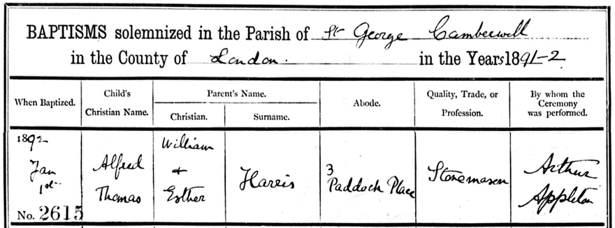 the baptism of Alfred Thomas Harris on the 1st January 1892 at St Geoges
